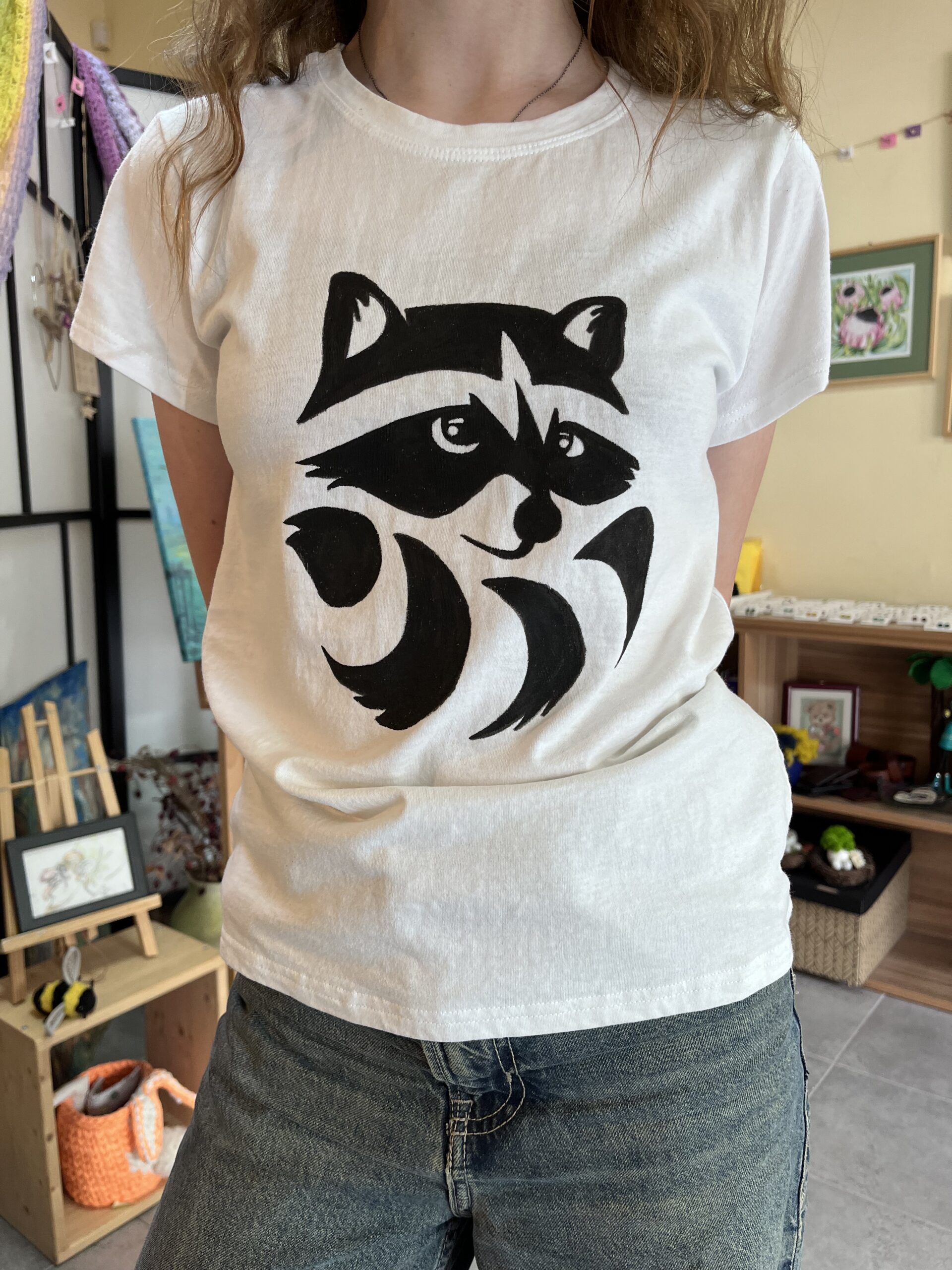 Детска тениска от 100% био памук, с ръчно нарисуван енот с висококачествени бои за текстил. Рисунката е устойчива и подходяща за пране в пералня. Мека, удобна и щадяща детската кожа – идеална за ежедневно носене.